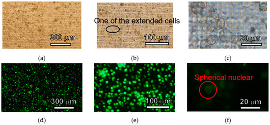 A cell culture plate with a 3D lattice structure made of SJI-001 was demonstrated as one of the scaffolds for cell culture. The cell culture plate fabricated with 1000 mJ/cm2 exposure energy for the 3D lattice structure is shown in Figure 6a. There were no breakages on the 3D lattice structure, which was in the micrometer-scale supported by the ring structure, which was in the millimeter-scale. The thickness of the 3D lattice structure and ring structure were 36.18 ± 0.88 µm and 58.53 ± 2.34 µm, respectively. The SEM images of the anterior and posterior sides of the 3D lattice structure are shown in Figure 6b,c, respectively. There were pores with sizes ranging from 2 to 4 µm. On the other hand, all pores were closed even when the exposure energy was changed from 700 to 1000 mJ/cm2. In addition, the 3D lattice structure fabricated with exposure energies lower than 800 mJ/cm2 had breakages. Therefore, in this experiment, a 3D lattice structure with a rough surface was fabricated, but the porous structure was not fabricated.