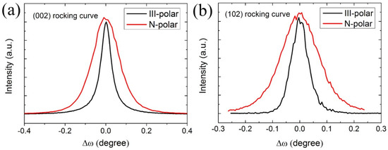 HRXRD (002) (a) and (102) (b) RC scans of planar III- and N-polar samples for dislocation estimation.