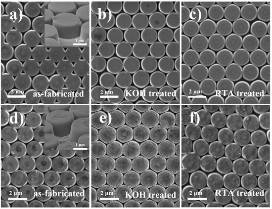SEM images of III-polar (a–c) and N-polar (d–f) nanopillar multiple quantum wells (MQWs) before and after the KOH or rapid thermal annealing (RTA) treatment. Tilted-view SEM images of as-fabricated nanopillars are shown in the inset of (a,d).