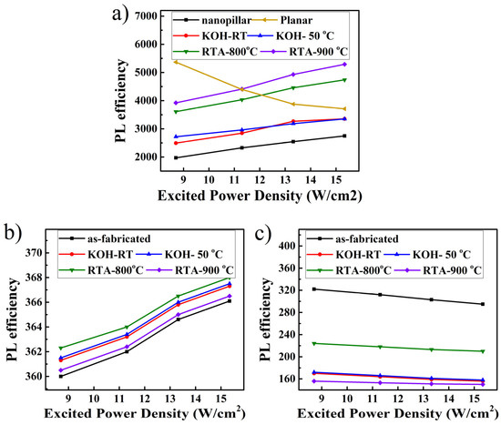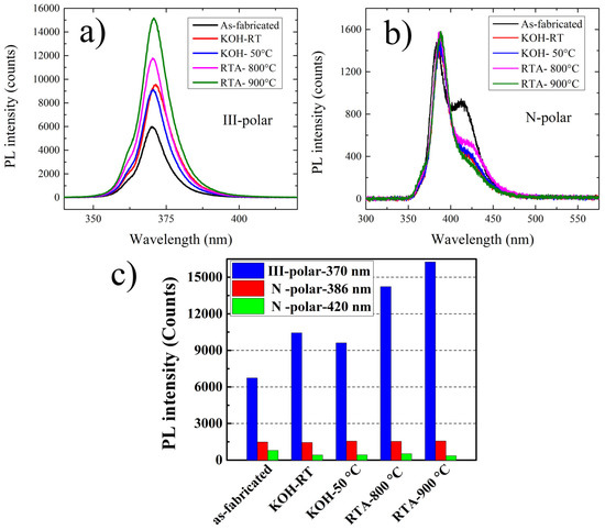 PL spectra subject to different surface treatments were further investigated. Figure 4a,b shows the PL spectra of III- and N-polar nanopillar MQWs after the respective treatments. PL intensities dramatically increased for III-polar compared to N-polar nanopillar MQWs. The highest PL enhancement reached 2.4 times for RTA of 900 °C. This can be well explained by the passivation of surface traps and the healing of surface-related defects [14]. However, the luminescence spectra were dramatically different for N-polar nanopillar MQWs. For the N-polar nanopillar MQW, a peak and a broad shoulder were identified in the PL spectra where the left peak was located at approximately 386 nm, and the right shoulder was located at 420 nm. The left peak intensity remained roughly the same after KOH or RTA treatment, while the longer wavelength shoulder reduced, suggesting that polarity played a critical role in the influence of surface treatment on luminescence. The integrated PL intensities of the III- and N-polar nanopillars are shown in Figure 4c, indicating that the effect of surface treatment was marginal on the N-polar MQWs compared to that of the III-polar samples.