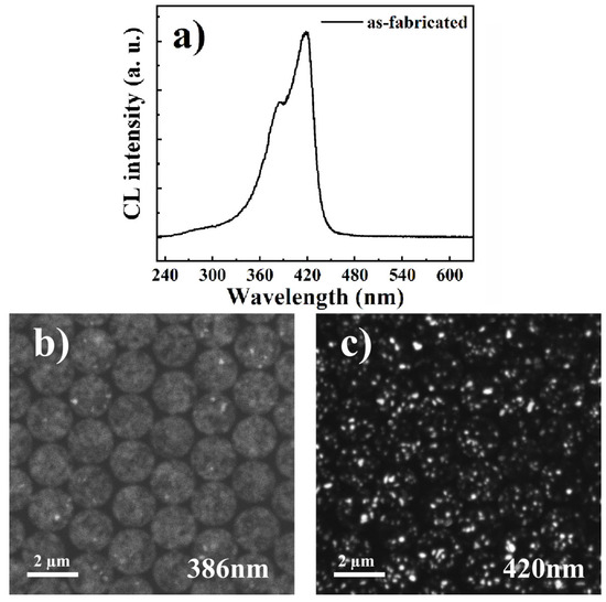 Figure 7a shows the CL spectrum of the as-fabricated N-polar nanopillars with two peaks located at 386 and 420 nm. The monochromatic CL mapping at 386 nm and 420 nm are shown in Figure 7b,c, respectively. Interestingly, the CL emission at 386 nm was uniformly distributed on the surface of the nanopillars, whereas 420 nm-emission originated from In-rich clusters, which are represented by the white dots. The red shift of CL spectra for N-polar nanopillars compared to that of the III-polar sample can be well explained by the in-phase separation in the MQWs leading to quantum dot-like luminescence centers at those In-rich clusters. Additionally, the carrier diffusion length decreased drastically due to indium phase separation, and the influence of point defects and threading dislocations were mostly screened by these potential minima, imposing no effect on the luminescence intensity. Therefore, even though surface trap defects were passivated by thermal and chemical treatments the luminescence intensities still remained the same for N-polar nanopillar MQWs because of carrier localization effects.