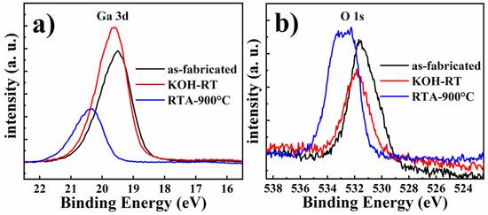 Finally, to further correlate surface stoichiometry to the enhanced UV emission of III-polar nanopillar MQWs, XPS measurements were carried out before and after RTA or KOH treatment. The de-convoluted Ga 3d peaks of the as-fabricated nanopillars, nanopillars after KOH treatment and 900 °C annealing are shown in Figure 9a. As indicated in the figure, the major Ga 3d core level peak consisted of two components at 21.0 ± 0.1 eV and 19.3 ± 0.1 eV corresponding to the binding energy of Ga–O and Ga–N, respectively. After KOH etching, the Ga 3d peak slightly shifted to higher binding energy, where the relative Ga–O component was increased, indicating that Ga cations were attacked by OH–, leading to the breakage of Ga–N bond and consequently formation of Ga–O bond. Furthermore, after RTA surface treatment, the Ga 3d peak shifts to even higher binding energy, but the total intensity was dramatically reduced. This indicates that chemical stoichiometry between Ga and N atom was deviating from 1:1 after thermal annealing. Figure 9b shows the O 1s core level peaks de-convoluted into three components with binding energies of 530.3 eV, 531.7 eV and 532.8 eV, corresponding to O2−, OH− and H2O species, respectively. It is clearly shown that after KOH etching, the overall intensity of the O 1s peak decreased, in agreement with the removal of naturally formed surface oxide under KOH etching. After thermal annealing, there existed a strong shift of O 1s peak towards higher binding energy, indicating a transformation from the Ga–O bond to Ga–O–H bond.