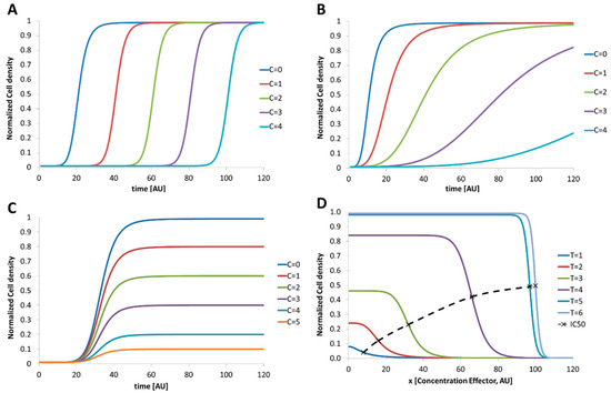 In the following passage we will discuss a variety of possible dose–response relationships from a theoretical point of view, if non-linear or unconventional temporal dose–response relationships are expected. For microbial assays, dose–response experiments usually monitor the growth of a starting cell number up to dense cultures in dependence on different effector concentrations. In general, cell culture growth passes through four subsequent phases [35]: (1) Lag phase. No increase in the cell number can be seen in this phase. After inoculation, the organism has to adapt their metabolic functions to the new conditions (2) Log or exponential phase. If the adaption was accomplished, the number of cells increases exponentially. The time which is required to double the number of cells is defined as the doubling time or generation time. (3) Stationary phase. The cell density reaches a maximum and no more growth can be observed. In this state, the further proliferation is limited by the availability of nutrition or excreted metabolic products. The organism changes its metabolism to a survival mode, and some develop persistence forms. ((4) Death phase. Here, the number of living cells starts to decrease because of lack of nutrition or excreted toxic metabolites which kills the cells. The required dose of an effector which is necessary to omit microbial proliferation is determined by a dose–response assay. Therefore, different batches of the investigated microorganism are treated with increasing amount of the effector and the temporal development of the cell number is monitored. If microorganisms are investigated with different doses of effectors (C=0 < C=1 < C=2 < C=3) the proliferation can be influenced in three different ways: (1) The lag phase is prolonged, but the organism proliferates thereafter without restrictions (Figure 1A); (2) The organism proliferates but in dependence on the effector concentration with different growth rates in the exponential phase (Figure 1B); (3) The organism proliferates but the maximum cell density in the stationary phase depends on the effector. A similar behavior will be observed if the cell morphology is changed by the effector. In this case, optical detection can lead to a lower signal because of the changed scattering cross section of the cells (variation in size or aggregation; Figure 1C). However, a combination of all these effects or even stimulated growth or abnormal behavior may be induced by different effectors. Typical result of a dose–response experiment for a regular behavior is the 50% inhibitory concentration IC50. The IC50 value is defined as the reversal point in the growth curve and depends on the measurement time point as shown in Figure 1D. Here, the cell densities in dependence on different effector concentrations are shown for different time points. The associated IC50 value increases in time and reaches a limit (dashed line). The accurate determination of the IC50-value is mandatory if the investigated effector should be used to suppress the microbial proliferation. However, if unknown organisms or unconventional cultivation conditions are used the temporal IC50 development as shown in Figure 1D has to be recorded carefully. Static end point assays using a fixed incubation time may lead to wrong results because the organism still grows with low proliferation rates.