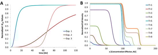 In Figure 2 the development of IC50 values for varying experimental conditions is shown. In Exp. 1 the IC50 values reach a steady state earlier than Exp. 2. Here, a steady IC50 is reached later because of a prolonged lag phase. Exp. 3 shows the development of the IC50 values when the generation time is prolonged by the effector. For Exp. 2 either the observation time is too short or the effector does not suppress the growth at all. However, for screening programs with such varying microbial growth conditions, droplet-based microfluidics can help to screen the time-dependent IC50 values in a fast and efficient way. For a more complex response of nonlinear growth behavior the response cannot be described by a plain parameter such as IC50. Here, the dose–response curve has to be considered. However, because of the varying response behavior the determination of inhibitory concentrations (IC50) depends strongly on the used microorganism, effector and experimental conditions. Especially the chosen medium has a strong influence and has to be assayed for each variation. If the investigated microorganism shows a complex behavior, the kinetic analysis is mandatory. In Figure 2B a nonlinear response is depicted. Here, the microorganism grows first like a usual kinetic (T = 1 to T = 5). But after a prolonged incubation (T = 6 to T = 9) a second growth phase at higher effector concentrations takes place. The microorganism proliferates with a prolonged lag phase and different morphology. However, for an effective growth inhibition an effector concentration higher than 150 (AU) is required.