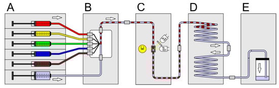 Schematic setup assembled for the generation of droplet sequences using a combination of different modules (A–E). Individual modules are connected by transparent FEP-tubes and standard fluidic connectors. (A) Syringe pump with six channels for fluid actuation (www.cetoni.de); (B) droplet generator; (C) photo-fluorimetric sensor module to record the initial photo-fluorimetric reference signals; (D) droplet sequence storage and incubation coil; (E) void volume.