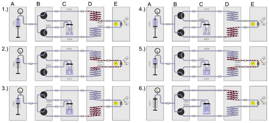 Setup scheme and operational sequence for the iterative measurement of droplet sequences. Modules: A: syringe pump; B: valve module; C: void volume; D: droplet sequence storage module; E: photo-fluorimetric sensor. Operational sequence: (1) After setup initiation, the droplet sequence is in the upper part of the storage module; (2) The (A) syringe pump dispenses fluid and pushes the droplet sequence through the (E) sensor; The (C) void volume container is filled by the carrier medium; (3) The droplet sequence is in the lower part of the (D) storage module and the (B) valve block is switched to aspirate carrier medium from the (C) void volume back into the (A) syringe; (4) When the (A) syringe is refilled the (B) valve module is switched to this flow path; (5) The (A) syringe delivers fluid and pushes the droplet sequence from the lower part of the (D) storage module through the (E) sensor into the upper part of the (D) storage module; (6) The droplet sequence is in the upper part of the (D) storage module and the (B) valve block is switched to aspirate carrier medium from the (C) void volume back into the syringe; When the syringe is refilled the sequence restarts at (1).