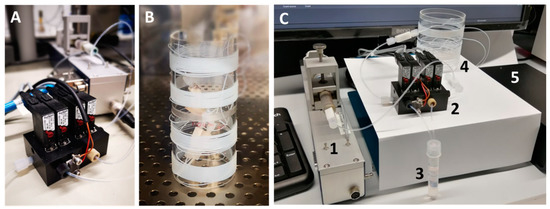 (A) Picture of the valve module required for dynamic cultivation using a single syringe pump; (B) storage module for droplet sequences located inside an incubator; (C) complete setup, including (1) syringe pump, (2) valve module, (3) void volume container, (4) storage coil and (5) photo-fluorometric sensor.