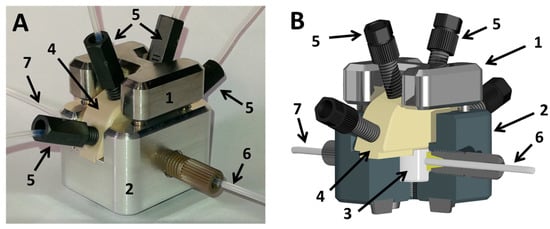 (A) Droplet generator (Figure 3B); (B) scheme of the droplet generator with sectional cut. (1) supporting frame top; (2) supporting frame bottom; (3) exchangeable PTFE inlet for droplet generation; (4) fluid manifold routing up to four different media streams into the PTFE droplet generator; (5) fluid connector for media supply; (6) fluid port for the carrier medium inlet; (7) fluid port outlet for the droplet sequence.