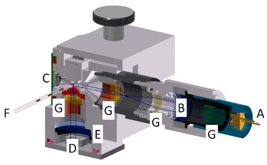 Schematic view on the photo-fluorimeter core unit. The design allows the simultaneous recording of absorbance and fluorescence signals from a passing droplet. (A) Excitation laser diode; (B) fluorescence excitation filter; (C) photodiode for absorbance measurement; (D) Photosensor (avalanche diode) for the detection of fluorescence light; (E) fluorescence emission filter; (F) FEP-tube for guiding the droplet sequences; (G) optical beam forming elements. The excitation wavelength of the laser diode (A) and filters (B + E) must be adapted to the desired fluorescence wavelength.
