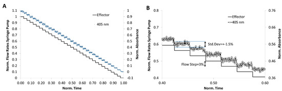 Analysis of the droplet composition accuracy regarding to the desired programmed composition. One-dimensional program with stepwise varied concentrations of a reporter dye (cochineal red A). A sequence with about 1700 segments was generated and the dye concentration determined by absorbance measurement using the photo-fluorimetric sensor module. (A) fluidic program (expected value, solid line) and measured value (blue dot line) for the droplet generation in 33 concentration steps; (B) detailed cutout of programmed (solid line) and measured values (dot line).