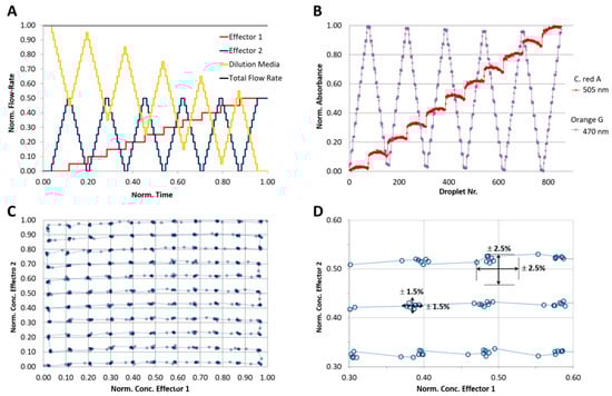 For the analysis of the achievable precision of a 2D concentration space, two effector model dyes must be used. A flow program with stepwise increase of the dye concentration was applied. To achieve a concentration resolution of 10% each, eleven different concentration steps (0, 10…100% of max. effector concentration) were programmed, resulting in 112=121 combinations. Two anionic indicator dyes, 1-mM cochineal red A and 1-mM Orange G were used as aqueous solutions. The total flow rate of the aqueous phase (sum of two effector solutions and dilution medium) was set to 64 µL/min and the flow rate of the carrier liquid was set to 136 µL/min. After the droplet formation, they were transported with a constant flow rate (200 µL/min) through a microflow-through photometer consisting of two light emitting diodes with peak wavelengths of 470 and 505 nm for monitoring the absorbance of the indicator dyes. Through the application of the program shown in Figure 9A, a sequence of about 800 droplets was generated. The achieved normalized absorbance of both dyes is shown in Figure 9B. The effectively obtained 2D-dye distribution deviates marginally (±2.5%) from the expected value.