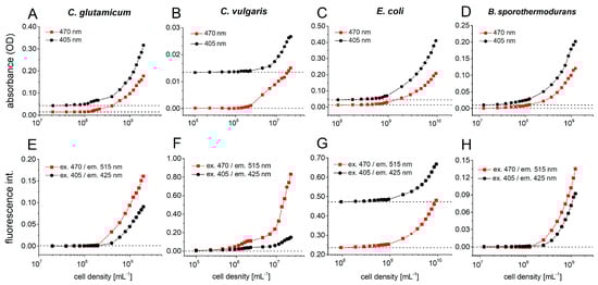 The dependency of the absorbance and autofluorescence intensity on the cell density of Corynebacterium glutamicum WT (ATCC13032) is shown in Figure 10A,E. C. glutamicum is a soil bacterium, which was described as a short, aerobic, Gram-positive rod that are capable of producing significant amounts of different L-amino acids. C. glutamicum is an important industrial microorganism and is currently used for production of about 106 tons of this amino acid annually, which is used as a flavoring agent [43]. From a cell density of 108 mL−1 onwards, the growth of C. glutamicum can be detected using dual photo- and fluorimeter.