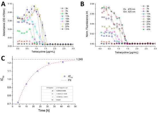 Dose–response curves with high concentration- and temporal-resolution based on the (A) optical density and (B) autofluorescence intensity of B. megaterium against tetracycline obtained in micro-fluid segment sequences with continuously varied effector concentrations; (C) IC50 value development during the incubation time from 7 to 41 h. Asymptotic fit reveals an IC50 value of about 1.245 µg/mL.