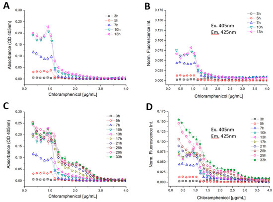 A higher tolerance was found with B. megaterium when chloramphenicol (CMP) was applied (Figure 12). Chloramphenicol is classified as a bacteriostatic antibiotic, which is produced naturally by Streptomyces venezuelae. It inhibits the formation of peptide bonds during the biosynthesis of proteins at the ribosomes [51]. In case of CMP, the non-linear response is depicted. Three different types of growth response with respect to different concentration ranges of CMP were found in the highly time- and concentration-resolved dose–response functions (Figure 12). Normal growth occurred at up to 1-µg/mL CMP and a complete suppression of growth was observed above 3 µg/mL for B. megaterium. At the beginning of the incubation time (3–13 h), both the photometric and fluorimetric signals showed strongly enhanced growth at a CMP concentration of 0 to 1 µg/mL and above 1 µg/mL both signal decreases sharply (Figure 12A). Up to 13 h incubation time, B. megaterium grows according to usual growth kinetics (see Figure 12D). After a certain time of incubation, however, a second growth phase at higher CMP concentrations takes place. Between the incubation time of 17–33 h, the optical density did not change significantly up to a CMP concentration of 1 µg/mL, while autofluorescence intensity increases continuously. After an incubation period of 17 h, a further growth of B. megaterium between 1–3-µg/mL CMP concentration was observed. This leads to a lower step (second shoulder) in the optical density and autofluorescence response curves at lower concentrations and to a steeper decline at higher concentrations in case of a cultivation time between 17 to 33 h of growth (Figure 12C,D). A sharp transition between full growth and reduced growth was found at 1.25-µg/mL CMP. The last measurement run, after 33 h of incubation, yielded an autofluorescence signal that was more than two times greater than it was when the incubation lasted just 17 h. A limited growth was only observed between 1.25 and 3-µg/mL CMP (Figure 12D).