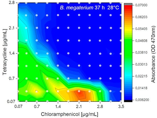 2D-isobolic plot of B. megaterium cell density signal (OD470) recorded after 37 h incubation with a combination of two different antibiotics (tetracycline (0.05–2.8 µg/mL), chloramphenicol (0.05–3.5 µg/mL)). Dots indicating measured data points averaged from about 12 droplets.