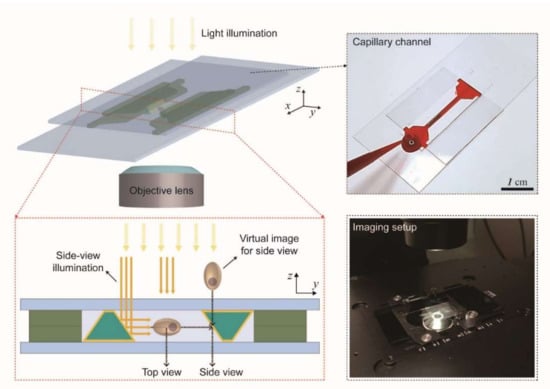 The use of additional mirrors orthogonal to existing mirrors could provide another side-view direction, which would lead to 3-direction imaging, and it could provide more information. However, the additional mirrors would make it difficult to construct a microchannel for the injection of samples. For 3-direction imaging, the microfluidic system can take a multiple-well structure instead of a channel structure. In this case, samples can be dispensed in the wells using a pipette.