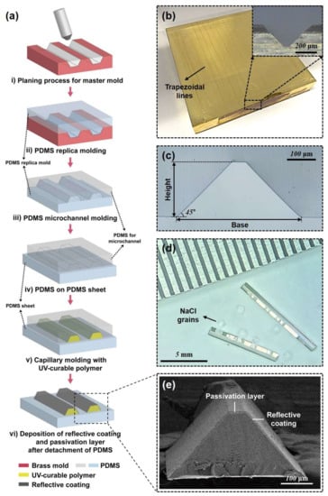 Figure 2. A fabrication process for a micromirror. (a) Fabrication steps for trapezoidal micromirror. (b) Brass mater mold with a trapezoidal cross-section. (c) Cross-section view of PDMS channel. (d) Optical microscopic image of micromirrors with grains of salt. (e) SEM images of a micromirror.