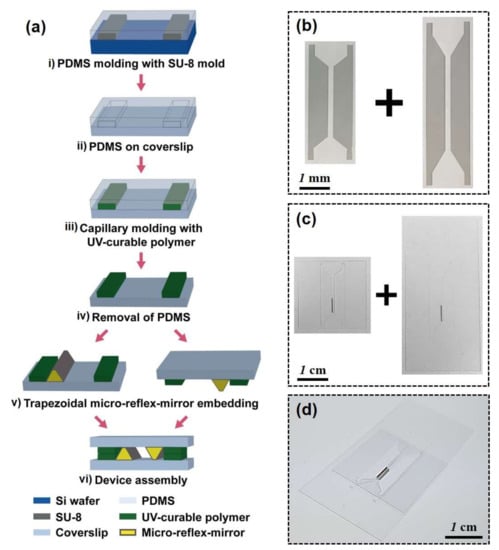 A micromirror-embedded coverslip assembly consists of two coverslips with different sizes (22 mm × 22 mm and 24 mm × 50 mm, ~120–170 μm thickness), where the trapezoidal micromirror is embedded on each coverslip (Figure 3). Two types of parallel column structures were designed and fabricated using capillary molding (Figure 3a). The PDMS mold was replicated from the SU-8 mold fabricated by conventional photolithography using SU-8 photoresist (i in Figure 3a, and Figure 3b, MicroChem). The parallel column structure has a gap distance of 1100 μm and a height of 100 μm, which is designed for subsequent alignment of the micromirrors and the two coverslips. After the PDMS molding process of the SU-8 pattern, the parallel column structures were patterned on each coverslip by capillary molding of UV-curable polymer (ii and iii in Figure 3a, and Figure 3c, NOA71, Norland). The micromirror was aligned next to the column structure and fixed using the UV-curable polymer as an adhesive (iv in Figure 3a). Finally, the two micromirror-embedded coverslips were aligned and assembled (v in Figure 3a, and Figure 3d). The coverslip can be permanently bonded with UV-curable polymer or simply stacked together depending on applications.