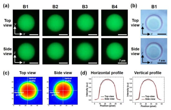 Figure 4. Evaluation of bidirectional imaging with fluorescent beads. (a) Fluorescent microscopy images of four beads from top-view and side-view. (b) Bright-field images of bead 1. (c) Fluorescent intensity contours of bead 1 and (d) its intensity profile through the center lines in horizontal and vertical directions.