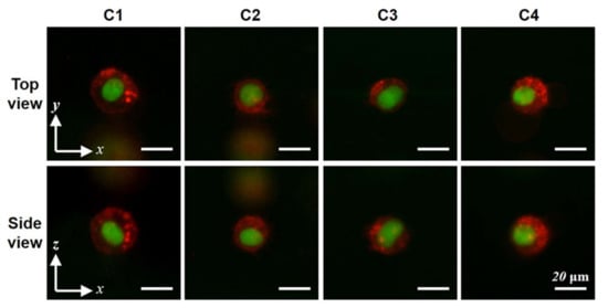 Figure 6. Fluorescent images of subcellular structure from top-view and side-view. Top-view and side-view images (obtained with 40× objective lens) of four H460 cells with the fluorescent-labeled cell membrane (red) and nucleus (green).