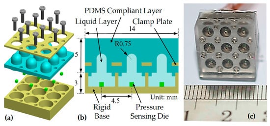 The mechanical structure explosion diagram is shown in Figure 1a. Some modifications have been made on the part of the flexible layer. The flexible layer changes to a continuous planar compliant layer, as shown in Figure 1b. The sensor array mainly consisted of five parts: rigid base, silicon pressure sensing die, silicone oil liquid layer, polydimethylsiloxane (PDMS) compliant layer, and stainless steel clamping plate. The overall size was 14 mm × 14 mm × 8 mm including nine sensor units in a 3 × 3 layout, with the spacing of sensor units of 4.5 mm. The thickness of the PDMS compliant layer was 5 mm. The selected silicon pressure sensing element was a cubic silicon pressure sensing die (Silicon Microstructures, Inc., SM5108C-060, Milpitas, CA, USA). The silicone oil liquid layer was filled with 50 cSt silicone oil (Dow Corning Inc. pmx-200, Midland, MI, USA). The silicone oil not only acts as a transferring medium of pressure conduction, it can also effectively protect the silicon-based sensor unit. The practical diagram of the sensor array is shown in Figure 1c.