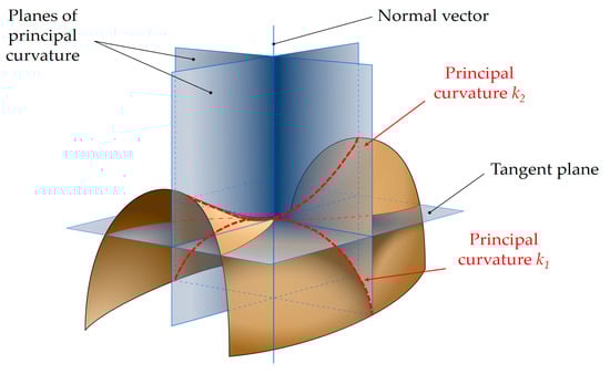Schematic diagram of the normal plane of the principal curvature at a point on the surface. Source: Wikipedia.