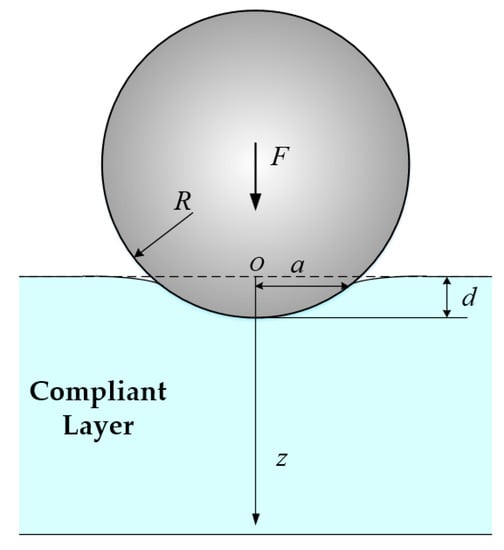 As shown in Figure 3, a rigid sphere with radius R comes into Hertz contact with the elastic semi-space surface. The force applied on the hemisphere is F, the maximum depth of pressing into the elastic semi-space surface is d, and the radius of the contact area is a.
