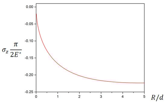 where ; E is Young’s modulus of the elastic semi-space material; is the Poisson’s ratio of the elastic semi-space material; and z represents the depth in the z direction. According to Equation (1), as z2/d is generally much larger than d, when the depth of pressing and the depth of the sensor array are determined, there is a non-linear mapping relationship between z normal stress and the curvature radius R of the object. In Figure 4, the relationship curve between z normal stress and curvature radius at the point where the depth is z = 5d is shown.