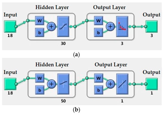 Back propagation (BP) neural network structure for object curvature discrimination: (a) single hidden layer surface type classification neural network structure; (b) single hidden layer curvature radius estimation neural network structure.