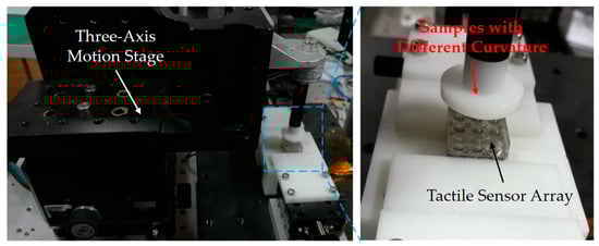 The experimental loading platform for object curvature discrimination is shown in Figure 7. The three-axis motion stage adopted the M460P of Newport, USA. The maximum stroke in the three directions was 25 mm, and the displacement precision could reach 0.01 mm. Experimental samples with different shapes and curvature radius are shown in Figure 8. In order to ensure the smooth contact process between the object and the tactile sensor array, the loading depth was set as 1 mm (starting from the contact surface), and the loading speed was selected as a constant 0.2 mm/s. The samples were made by 3D printing technology using photosensitive resin, which can be considered as nearly rigid compared with the compliant skin layer of the tactile sensor array. The shape of the samples included three types: plane, convex sphere, and convex cylinder. There were 30 samples with different curvature radius values on the convex sphere and convex cylinder, respectively. The curvature radius range was 1–30 mm, and the difference of curvature radius between adjacent samples was 1 mm.