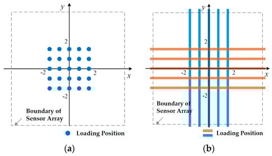 The discrete distribution of sensor elements, the boundary constraint of sensor array, and the limitation of manufacturing process will surely cause the non-uniformity of the sensor array performance, thus the contact position will surely affect the signal combination of the tactile sensor array. For this reason, contact loading at different positions on the surface of the compliant skin layer of the tactile sensor array was carried out, and the acquired sample data at different contact positions was used for neural network training. Obviously, the axis direction of the convex cylinder will also affect the signal output of the sensor array. In order to simplify the analysis, but not lose the generality of validation of the model, the direction parallel to the two axes is applied during convex cylinder experiment. The loading position distribution of the plane and convex sphere for the automatic contact experiment is shown in Figure 9a, and the loading position distribution of convex cylinder is shown in Figure 9b. In order to ensure complete and effective contact between each sample and the compliant skin layer, and considering the surface size of the compliant skin layer, the loading points for the planar or convex spherical samples were set as a 5 × 5 lattice evenly distributed around the center point of the surface origin, with the spacing of the loading points being 1 mm, with 25 different loading positions in total. The loading position for the convex cylindrical sample was set as a 1 × 5 linear array with respect to the X-axis or Y-axis symmetry position, and the loading position interval was 1 mm, with a total of 10 different loading positions.
