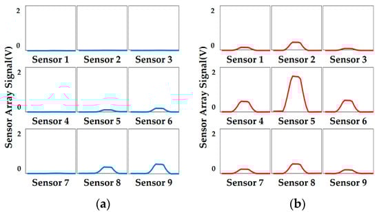 The raw output data of the sensor array is shown in Figure 10, and sensors 1–9 represent the nine sensing elements in Figure 1. The sample used in Figure 10a is a sphere with a curvature radius of 5 mm, and the loading position is shown in the lower right corner in Figure 9a; the sample used in Figure 10b is a sphere with a curvature radius of 15 mm, and the loading position is the center of Figure 9a. Two kinds of data, named as time-domain data and frequency-domain data, were used as the sample data of the neural network, which were extracted from the signals acquired from the automatic contact experiment. Time-domain data are the measure of the tactile sensor array response sensitivity in a process of stable contact. Since the object loading process is uniform loading at a constant speed, the variation of the output amplitude of the sensor array signal in the same interval is extracted as the steady-state output indicators. Frequency-domain data are the measure of how fast the sensor array responds to the stress change of contact interface, which can be reflected by the change of the principal frequency in the frequency domain. Therefore, fast Fourier transform (FFT) was carried out on the output response signal of the sensor array in the whole contact process to find the corresponding principal frequency as the dynamic response indicators. The sensor array output signal loaded at each position of each experimental sample was recorded, and the data of the above two aspects were also extracted and normalized. The experiments were carried out for the different shapes and different curvature samples shown in Figure 8, and a number of sample data could be extracted for each. Each set of data for the specific sample contained 18 input data (nine time-domain characteristics and nine frequency-domain characteristics of the data) and two output data (object surface type code and radius of curvature, while the surface is plane so only one type of code is needed). Thereby, the corresponding sample database was established for the training and testing of the neural network. During the training, the Levenberg–Marquardt training function was used to adjust the connection weights and threshold of the neural network, and mean square deviation was used to evaluate the output error of the network.