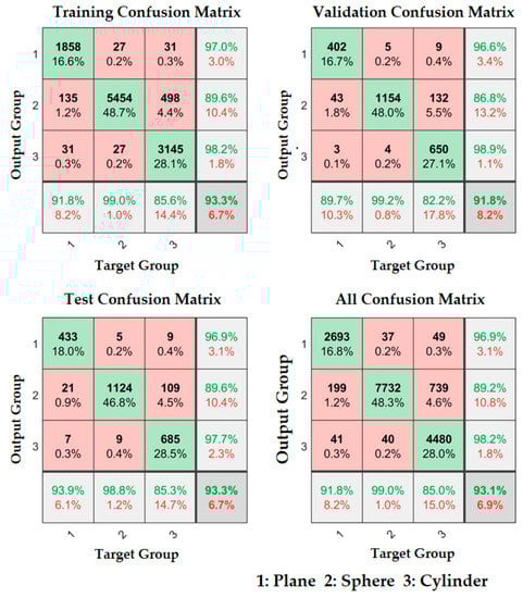 First, the surface types of the samples were classified, and 70% sample data were randomly selected from the sample database for neural network training. That is, the total amount of data in the sample database was 16,010, of which 11,206 random sample data were used for training. The sample data included surface types, different loading positions, and different curvatures. The confusion matrix results of training, verification, and testing of the neural network for surface type classification are shown in Figure 11, where codes 1, 2 and 3 represent plane, convex sphere, and convex cylinder, respectively. The target group represents the real surface type code, and the output group represents the predicted surface type code. The green box in the figure represents the number and proportion of samples whose predicted code was consistent with the actual code, while the pink box represents the number and proportion of samples whose actual code was incorrectly predicted to be another code. The green number in the light gray box at the bottom indicates the correct prediction proportion in the sample with the actual code, while the red number indicates the wrong prediction proportion. The green number in the light gray box on the right indicates the correct prediction proportion in the sample with corresponding prediction output code, while the red number represents the wrong prediction proportion. The green number in the dark grey box at the bottom right represents the proportion of all correctly predicted samples in the total sample, while the red number represents the proportion of incorrectly predicted samples.