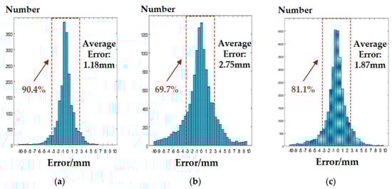 Curvature radius estimating results: (a) estimating the error distribution of the convex sphere curvature radius; (b) estimating the error distribution of the convex cylinder curvature radius; (c) estimating error distribution of the curvature radius with unknown surface types.