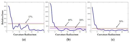The experimental results are shown in Figure 12 and Figure 13. Figure 12 shows the distribution of the average curvature radius estimating error. The error of model A for the convex sphere curvature estimating was 1.18 mm, and the estimating error of 90.4% samples was less than 3 mm. The average curvature radius estimating error of model B for the convex cylinder curvature estimating was 2.75 mm, and the estimating error of 69.7% samples was less than 3 mm. The average curvature radius estimating error of synthetic model C for the mixed convex sphere and cylinder curvature estimating was 1.87 mm and the estimating error of 81.8% samples in total was less than 3 mm. Figure 13 shows the distribution of the mean relative error at different curvature radius. Figure 13a is the curvature radius estimation results of model A for the sphere. When the curvature radius was larger than 5 mm, the relative error was less than 17%. The relative error increased to 60% when the curvature radius was 1 mm (i.e., the mean error was 0.6 mm). Figure 13b is the curvature radius estimated by model B for the cylinder. When the radius of curvature was larger than 5 mm, the relative error was less than 40%, and when the radius of curvature was larger than 7 mm, the relative error was less than 24%. The relative error increased sharply when the curvature radius was close to 1 mm, reaching 300% (i.e., the mean error was 3 mm). Figure 13c is the estimation results of the curvature radius of all types by the synthetic model C. When the curvature radius was larger than 5 mm, the relative error was less than 20%. The relative error increased to 200% when the curvature radius was 1 mm, (i.e., the mean error was 2 mm). Therefore, the established neural network curvature radius estimating model could estimate the surface curvature radius of convex sphere and convex cylinder, respectively, and the synthetic model C could successfully estimate the object curvature radius without the prior information of surface types.