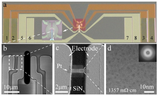 The in situ heating and biasing experiment was conducted on the nano-chip, as shown in Figure 1a, in which electrodes 1, 2, 3, and 4 are for heating, and electrodes 5, 6, 7, and 8 are for biasing. This kind of surround heating type ensures the uniform temperature rise in the center biasing area [9]. Figure 1b shows the enlarged biasing area with four electrodes. The Pt interconnector was deposited between two of the electrodes on the SiN membrane after back-etching (in order to make the thickness suitable for TEM characterization) as shown in Figure 1c. In Figure 1d, the EB-deposited Pt interconnector manifests as an amorphous phase according to the homogeneous contrast in the high-resolution electron microscopy (HREM) image and diffuse rings in the inset fast Fourier transform (FFT) pattern. The resistivity of the as-deposited Pt interconnector was measured as 1357 mΩ·cm, which is too high to use as an interconnector.