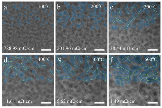 To investigate the possible microstructure evolution with temperature of the EB-deposited Pt interconnector, an advanced in situ TEM technique was used to record a set of HREM images at different temperatures, as shown in Figure 2, in which the resistance is also measured simultaneously. When the Pt interconnector was heated to 100 °C, its resistivity was reduced from 1357 mΩ·cm to 788.98 mΩ·cm, as shown in Figure 2a, and small Pt nanocrystal grains began to appear in the film, in which some grains in the top half of the picture are painted blue. When the temperature increases to 200 °C, the grain size of the Pt nanocrystals becomes larger, and the number of Pt nanocrystals also increases, as shown in Figure 2b. At this temperature, the resistivity of the Pt interconnectors further decreases to 201.96 mΩ·cm. As the temperature continues to rise to 300 °C, these Pt grains grow further, and even merge to form the possible conducting pathways (denoted by dotted yellow lines), as shown in Figure 2c, accompanied with the continuous resistivity decreasing [43]. From 400 °C to 500 °C in Figure 2d,e, Pt resistivity continues to drop, while Pt grains further grow and combine, which benefits its conductivity. Increasing to 600 °C in Figure 2f, there is a significant increase in grain size, in which most of the grains are joined together to form a nanocrystal network. At this moment, the Pt resistivity has decreased by near three orders of magnitude compared with its initial state. Although its resistivity is still higher than pure bulk Pt metal (1.06 × 10−2 mΩ·cm), it can be used in in situ biasing research as an interconnector. The detailed Pt grain size distribution with temperature is also fully compared in Figure 3, which indeed shows that the density of nanograins gradually decreases and the average size increases during the in situ heating process.