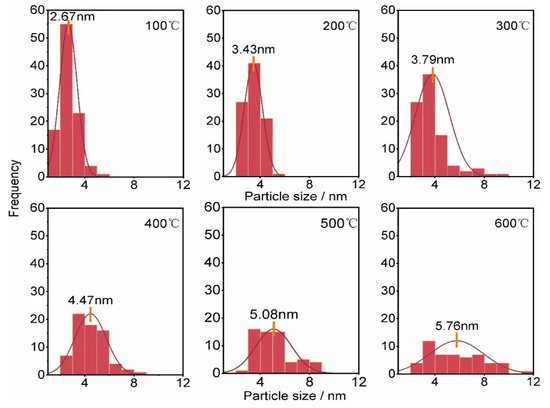 The distribution of the Pt particle size and corresponding fitted curves at different temperatures extracted from Figure 2, respectively. During the heating process, the number of particles gradually decreases and the average size increases due to the growth of nanograins.