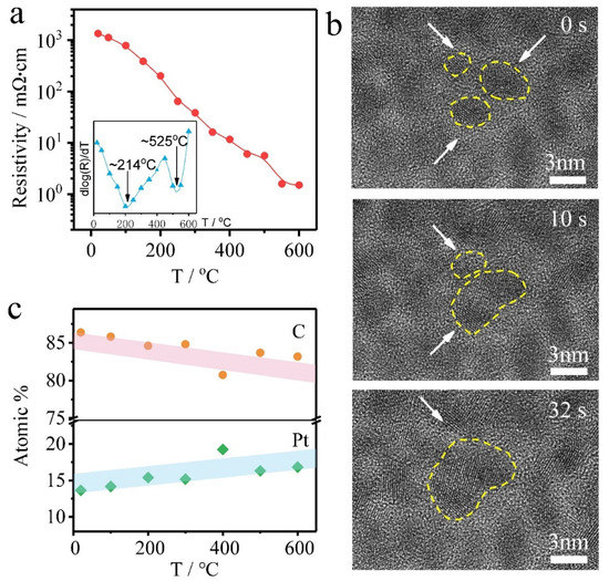 From the above results, it is clear that the crystallization, growth, and connection of Pt grains directly affect the electrical properties of the Pt interconnector. Hence, to further analyze the electrical property of the Pt interconnector, its resistivity as a function of temperature is plotted in Figure 4a, exhibiting a decreasing resistance trend. The inserted corresponding derivative of the ogarithmic resistivity to temperature (dlgR/dT) curve reveals two resistivity transition temperature at 214 °C and 525 °C, respectively. The first resistivity drop is due to the decomposition temperature of the organic Pt metal precursor material being around 250 °C [28], and also ascribed to the formation of conducting pathways, referring to Figure 2b,c. To obtain a better view, a real-time grain combination process lasting about half a minute at 250 °C is shown in Figure 4b, in which three small nanocrystal grains (denoted by yellow dotted lines) gradually merge to form a larger one (the detailed process can be seen in Supplementary Video S1). Additionally, the second resistivity drop, ascribed to the growth of Pt nanocrystals and the formation of a complete conductive network inside the Pt interconnector, is proven by the obvious grain growth from Figure 2e,f and Figure 3. Another concern is the possible composition variation of the Pt interconnector with increasing temperature. (CH3)3Pt(CpCH3) precursor includes elements Pt, C, and hydrogen (H). Considering that H is beyond the detection limit of energy-dispersive X-ray spectroscopy (EDS), we mainly concentrate on the composition variation between the C and Pt elements at different temperatures, as shown in Figure 4c. Conspicuously, the atomic amount of C decreases while Pt content increases with increasing temperature, indicating reducing organic content as reported in literature [35,37,39]. Therefore, the decrease of the organic matter content is also one of the reasons for the falling resistivity. On the other hand, the organic matter content still occupies the main component of the Pt interconnector, which is unfavorable to continue to improve its conductivity.
