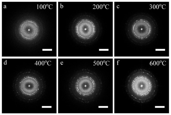 The Fast Fourier Transform (FFT) patterns extracted from HREM images in Figure 2. As the increasing of temperature, the polycrystal rings become more and more clear as shown in (a–f). At high temperature, some discrete spots can be found due to the growth of Pt nanograins. Scale bars, 5 1/nm.
