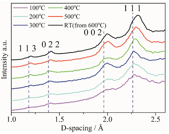Except for the structure, composition, and resistivity variation of the Pt interconnector during heat treatment, the lattice parameter may also change. To investigate the lattice parameter variation during the heating process, the FFT patterns at different temperatures were extracted from the HREM images (Figure 2), as shown in Figure 5. Afterwards, corresponding raw radially-integrated diffraction curves were obtained, as shown in Figure 6, in which the black dotted lines denote the position of the corresponding lattice planes in pure Pt ((JCPDS No. 04-0802). Inspecting the curves in Figure 6, the position of the peaks of (111) and (002) gradually shifts to the right side, and this phenomenon becomes more obvious above 400 °C, indicating the increasing d-spacings of the corresponding lattice planes of the Pt interconnector with temperature. The bias of the (022) and (113) peaks in Figure 6 are not so obvious, especially at lower temperatures, which may be due to the weakness of the corresponding rings and the poor signal-to-noise ratios and which are related to the crystallinity. After cooling to room temperature from 600 °C, the lattice parameter is still larger than that of the initial state, implying not merely a simple thermal expansion, but containing other factors.