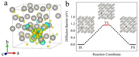 From the above results, the relationships of microscopic evolution to resistivity variation of the EB-deposited Pt interconnector are articulated clearly, and heat treatment can effectively reduce its resistivity. With the temperature increasing, Pt interconnector has undergone crystallization, organic matter decomposition, Pt nanocrystals growth, grain connection, conductive path formation, and lattice expansion, which are combined actions to cause a drop in resistance. Finally, the resistivity of the EB-deposited Pt interconnector still has a gap with pure Pt metal. Consider that, in addition to Pt metal, C is also an important component in this interconnector, which should be taken into account here. Since Figure 6 reveals the fact that Pt lattice is expanding and the characterization of C atoms is difficult in TEM, we attempt to investigate the possibility of C atom doping into the Pt structure via first-principle calculations. Figure 7 shows the calculation of one C atom in a tetrahedral position in the Pt lattice, which has a slightly lower formation energy than that in the octahedral position (Table 1). The positive formation energy demonstrates that C atoms do not desire to stay in the interstitial positions of Pt. After C doping, the distance of the second nearest neighbor Pt atoms is increased from 3.93 Å to 4.11 Å (Table 1), exhibiting lattice expansion consisting of the experimental result in Figure 6. Considering the electron transfer effect between C and Pt atoms, as shown in the charge density difference (CDD) map in Figure 7a, the formation of covalent bonds between C and Pt atoms localized the free electrons. Since the C atom obtains electron and its surrounding Pt atoms lose it, according to the Bader charge analysis, the electronic-carrier concentration would decrease, resulting in the conductivity of the Pt interconnector not reaching that of pure Pt metal [53,54]. However, the thermal stability of the interstitial C atom in the Pt lattice seems poor by calculating the diffusion energy barrier by moving a tetrahedral C atom to another equilibrium position, as shown in Figure 7b. The high diffusion barrier of 1.12 eV, as shown in Figure 7b, may result in a little C in the nterstitial positions from the kinetic perspective. Thus, the lattice expansion could be another reason; for instance, the grain size change of the Pt nanoparticles increased from the initial 2–3 nm to above 5 nm during the in situ heating process, which can also bring the change of the lattice parameter. Referring to the literature [55,56,57,58,59], there is a change in the opposite trend of the lattice parameter evolution to the particle size. For instance, no variation in the Pt-Pt distance was observed for Pt nanoparticles deposited on aluminum oxide films [57]. The unit cell parameter even linearly increases with the reducing particle size [59]. However, when introducing C into the Pt material system, Scardi et al. [55] found that the Pt lattice parameter would increase when the Pt particle is dispersed on the C support. A similar lattice parameter variation tendency is also confirmed for C-supported Pt nanoparticles, which is interpreted by the continuous-medium (CM) model [58,60]. Though C atoms are easily moved out of the Pt lattice, according to the calculation results, it may still be have an assistance effect to increase the Pt lattice parameter when the nanoparticles grow. Thus, C still tends to stay outside the Pt nanocrystals and form composites with Pt, which is the reason that the conductivity of annealed the EB-deposited Pt interconnector is not as good as that of pure Pt metal:
