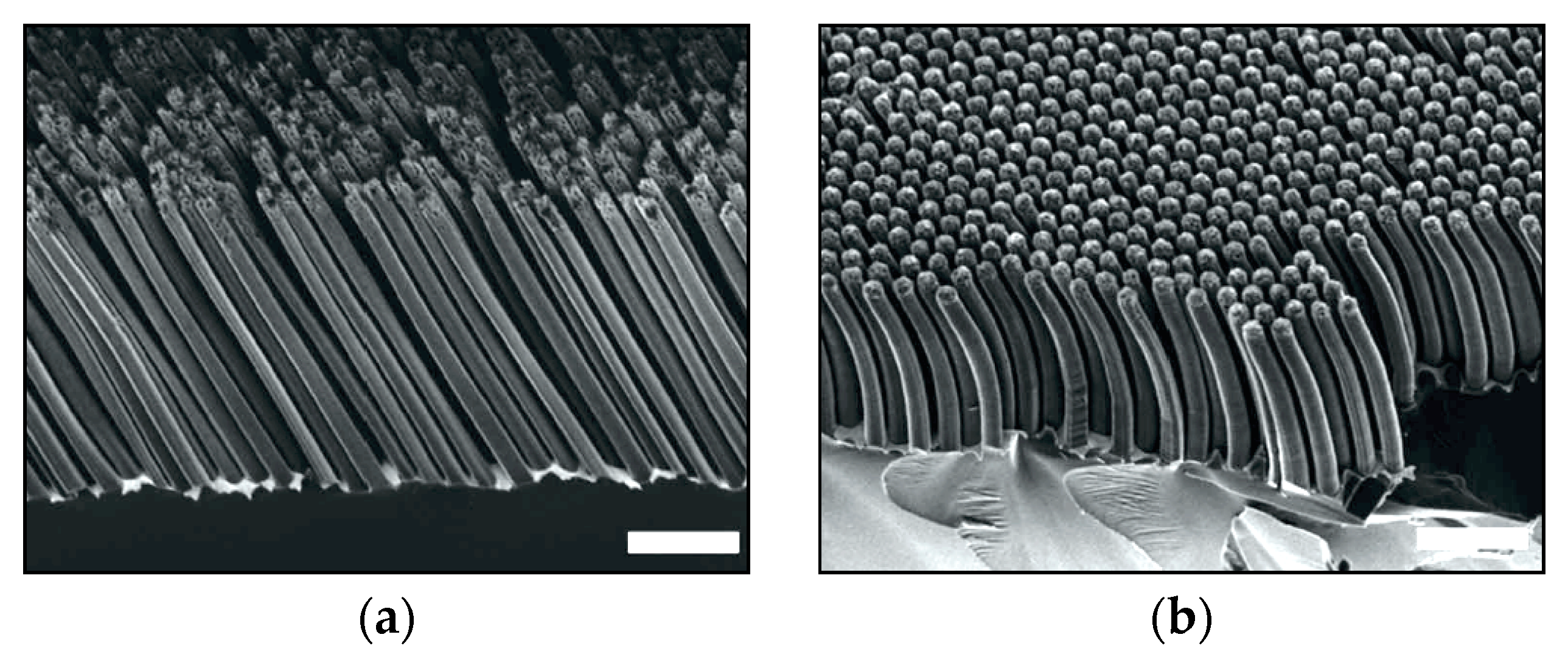 - Chang, S.-W.; Chuang, V.P.; Boles, S.T.; Ross, C.A.; Thompson, C.V. Densely Packed Arrays of Ultra-High-Aspect-Ratio Silicon Nanowires Fabricated using Block-Copolymer Lithography and Metal-Assisted Etching. Adv. Funct. Mater. 2009, 19, 2495–2500. [Google Scholar] [CrossRef]