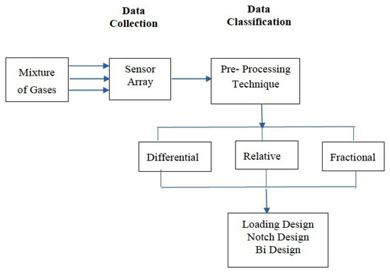 The block diagram for the flow of gas sensing and classification is shown in Figure 1. The MOS sensor (sensor array) collects the gas mixture produced by an industrial plant, and then, further processes the mixture via a preprocessing technique using PCA.