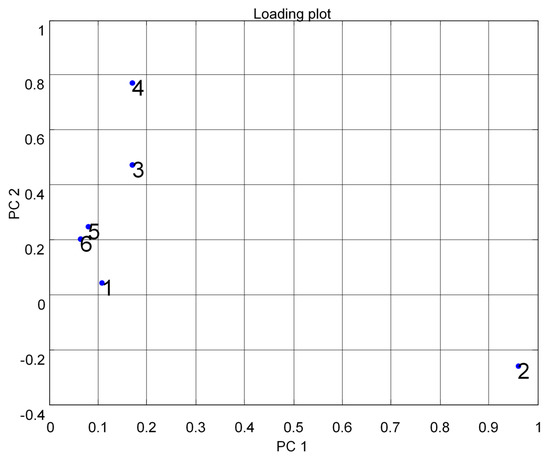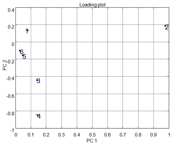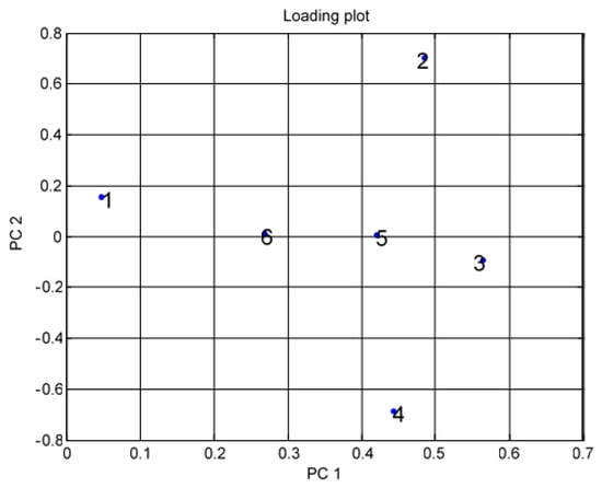 Preprocessing data for VOCs such as A, E, and P was conducted using PCA. The loading design for the performance of MOS sensor arrays was used for differentiation in the variations of voltage readings (Figure 4). Herein, we present one to six different irregular points in this design. In Figure 4, point one shows TGS 2600, point two shows TGS 2602, point three shows TGS 2611, point four shows TGS 2620, point five shows MICS 5135, and point six shows MICS 5521.