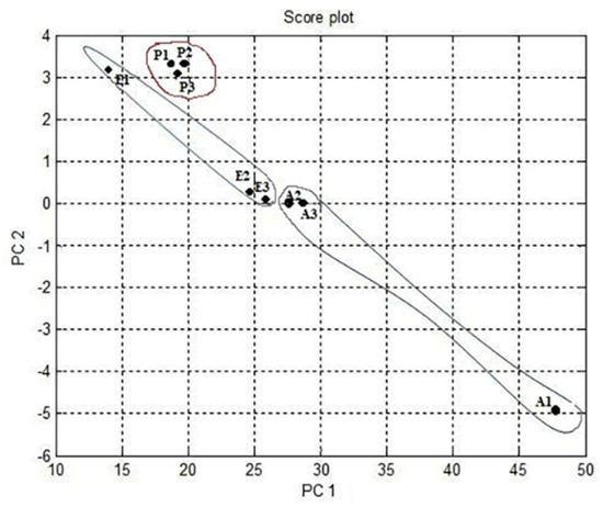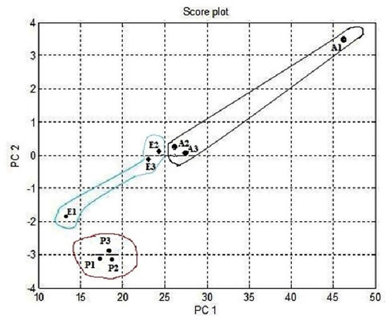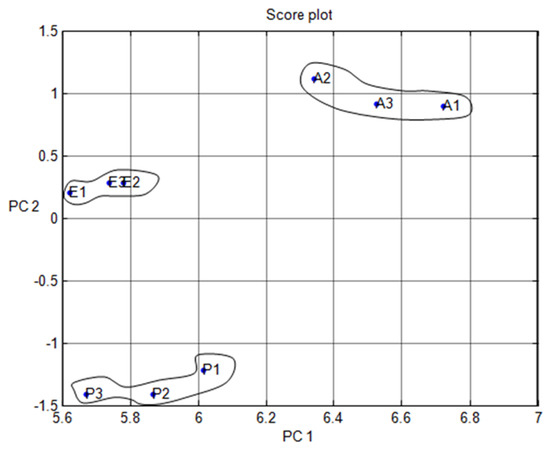 Figure 4 shows the results of the data difference design. It had no sensor set response correlated with the other. Figure 5 shows that the notch design for multivariate techniques examines the relationships among data difference considerations. Here, a multivariate method PCA was used to discriminate all three clusters of A, E, and P, represented in one cluster each, using a separate boundary. Figure 5 also shows that PCA can discriminate all these three clusters by the separate boundary. In Figure 6, both variable scatter models and observations are presented together. On the left part of Figure 6, the principal component of MOS sensors is presented, while observations of gas samples are presented on the right side.