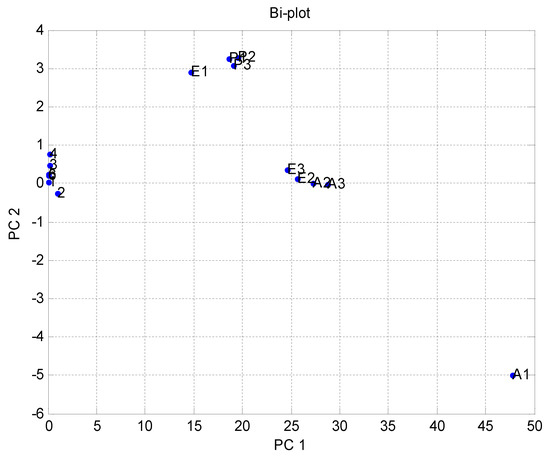 The notch design shown in Figure 11 investigated the relationships between the study of data differences. Figure 11 also shows that the multivariate technique (PCA) can discriminate against all three clusters of A, E, and P by the separate boundary. Hence, PCA is helpful in the relative data preprocessing method to classify all three gas samples. Figure 12 summarizes the results of the loading and notch design together in one design known as the Bi design. Both variable scatter models and observations are shown in Figure 12. As can be seen, the principal sensor components are presented on the left part of Figure 12 while observation of gas samples are seen on the right part of Figure 12. The primary sensor component was usually distributed and did not show the same act for preprocessing done by relevant data. The information’s point was too crowded because it became difficult to distinguish the smell by the relative method.