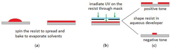 Dating back to the 1950s, new techniques in microfabrication technology developed rapidly when the planar technologies were introduced into the microelectronics [19,20]. At the beginning of the 1980s, with major progress in microelectronic systems and taking the advantages of miniaturization and parallel manufacturing, the concept of microelectromechanical systems (MEMS) appeared as the integration of mechanical and electrical functions into a single chip with small structures for various applications (e.g., biochemical applications and chemical engineering applications) [2,19]. Similar microfabrication techniques as those used in microelectronics to manufacture integrated circuits (IC) in the semiconductor industry, are used to fabricate MEMS microdevices [1]. Generally, by repeating particular orders of photolithography, etching techniques and thin-film deposition steps, fabrication of a micro/nano scale structure on planar substrates is being achieved. Figure 1 demonstrates the basics of the photolithography process. It starts with spinning a photoresist with a certain speed to spread to a desired plate thickness on the substrate. The next step is to heat up the photoresist to evaporate any solvents. The photoresist should be then irradiated with UV light while passed through a photomask. A post exposure bake may be needed to accelerate the curing of the photoresist. For the positive tone interaction, the areas which are exposed to UV radiation are removed after development. This is opposite for the negative tone. Interested readers are referred to References [21,22,23] for a review of microfabrication and microstructure formation technologies.