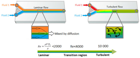 Laminar versus turbulent flow in the microfluidic channels. Figure is reproduced from Reference [44].