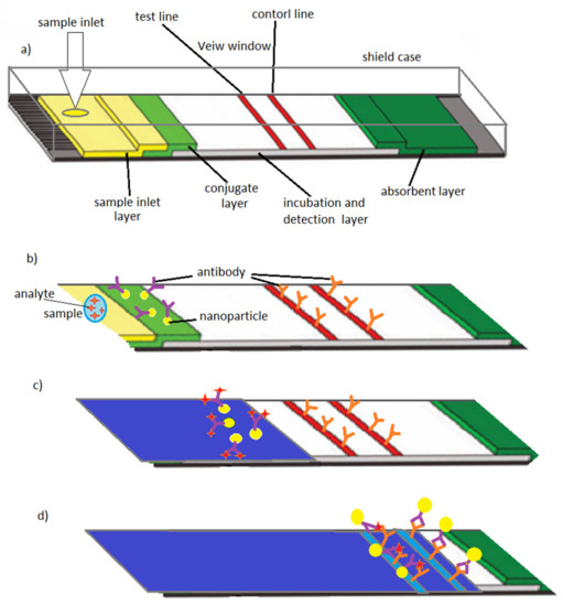 Lateral flow assay schematic design: (a) A lateral flow test strip including sample inlet, sample layer, conjugate layer (i.e., reactive agents and detection molecules), incubation, detection zone and final absorbent layers including test and control lines (i.e., analyte detection and functionality test), (b) introduction of sample into the test strip via sample inlet, (c) antibodies conjugated to labeled nanoparticles start to bind to the analyte, (d) antibodies with antigens bind to the test line and antibodies without antigens bind to the control line. Reproduced from Reference [39].